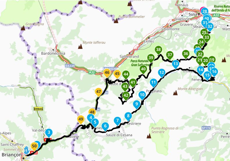 The intial climb started at Fenestrelle (15) and rose via hairpins to point 19, where the road turned to fairly good loose gravel until point 22, where tarmac restarted.